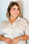- Camisa: Cuello camisero clásico de botones a tono. Manga corta con caída natural. - Pantalón: Corte recto y fluido que brinda comodidad y movimiento.