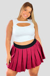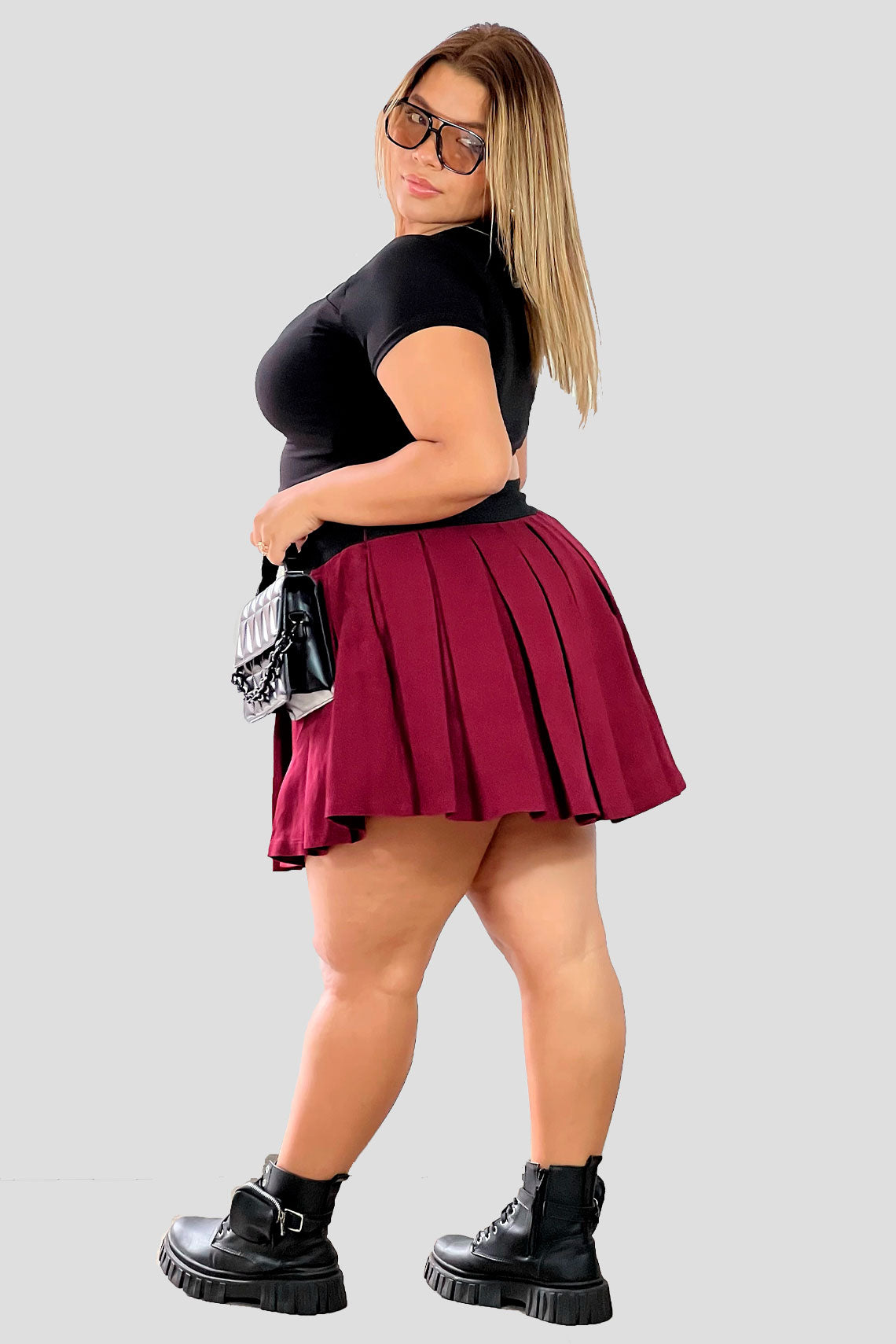 Falda corta con diseño de pliegues marcados y pretina ancha en tela elástica para un ajuste cómodo y favorecedor. Fabricada en tela rigida le da movimiento y frescura.