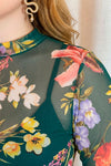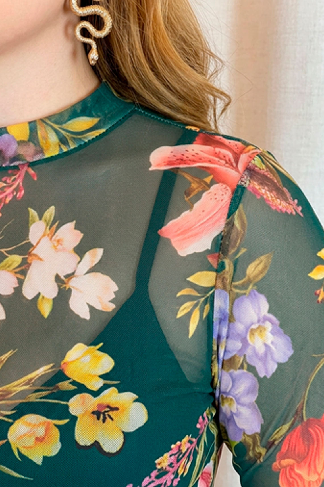 Buso de malla transparente con estampado floral vibrante, corte ajustado y mangas largas, ideal para lucir un look atrevido y femenino.