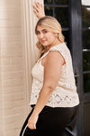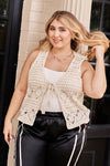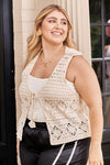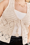 Chaleco corto tono crema con detalles florales. Cuenta con un diseño frontal abierto que se asegura con un lazo ajustable para un toque femenino y versátil.