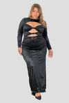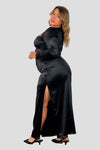 Vestido largo confeccionado en satin. Presenta escote en forma de nudo central,con cortes sutiles en la parte frontal y abertura lateral que aporta movimiento. Manga larga y ajuste ceñido que resalta la caida del vestido.