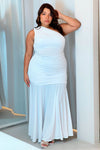 Vestido largo de un solo hombro con drapeado suave que se ajusta de forma natural al cuerpo, silueta fluida y ligera que estiliza aportando movimiento. es una prenda elegante, comoda y atemporal