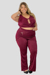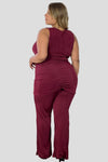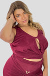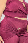 Set de dos piezas elaborado en tela tipo terciopelo liviano con brillo sutil. Incluye top sin mangas con escote en caida y abertura central, pantalon bota ancha y fruncido lateral y detalle en argolla metalica. Ofrece comodidad y realce natural